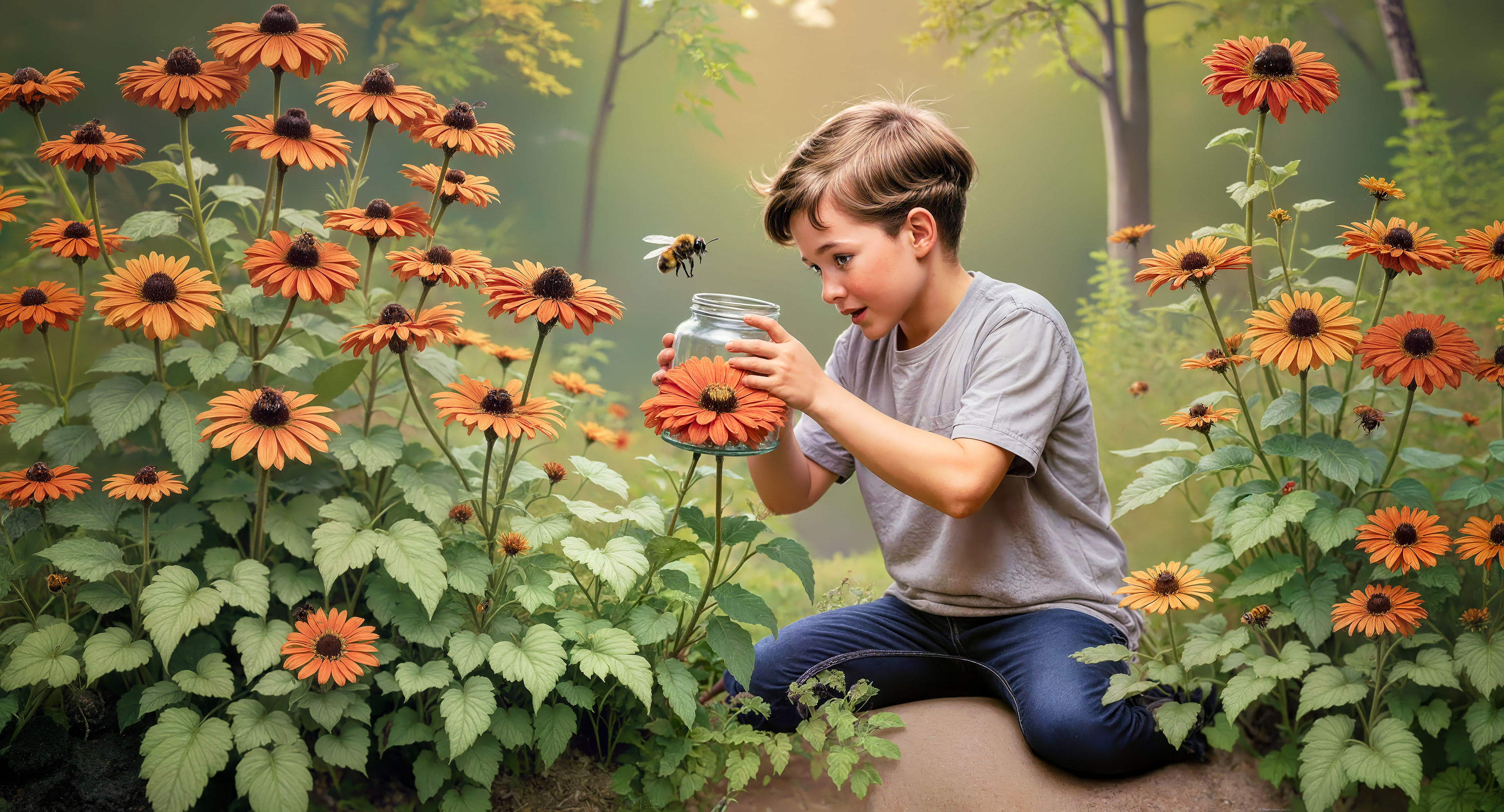 Consider a captivating tale of a boy with bees. His fascination outweighs his fear. The fear of getting stung. Imagine a young lad, knee-deep in a blooming bounty of orange daisies, his eyes wide with wonder as he clutches a simple glass jar. Inside? Not just any captured critter, but a buzzing bee, hovering mid-flight like it’s deciding whether to dive in or dash. The boy’s face is a mix of mischief, marvel, and misgivings—a pure, compelling curiosity in action. His bravery seems boundless as adventure trumps trauma.